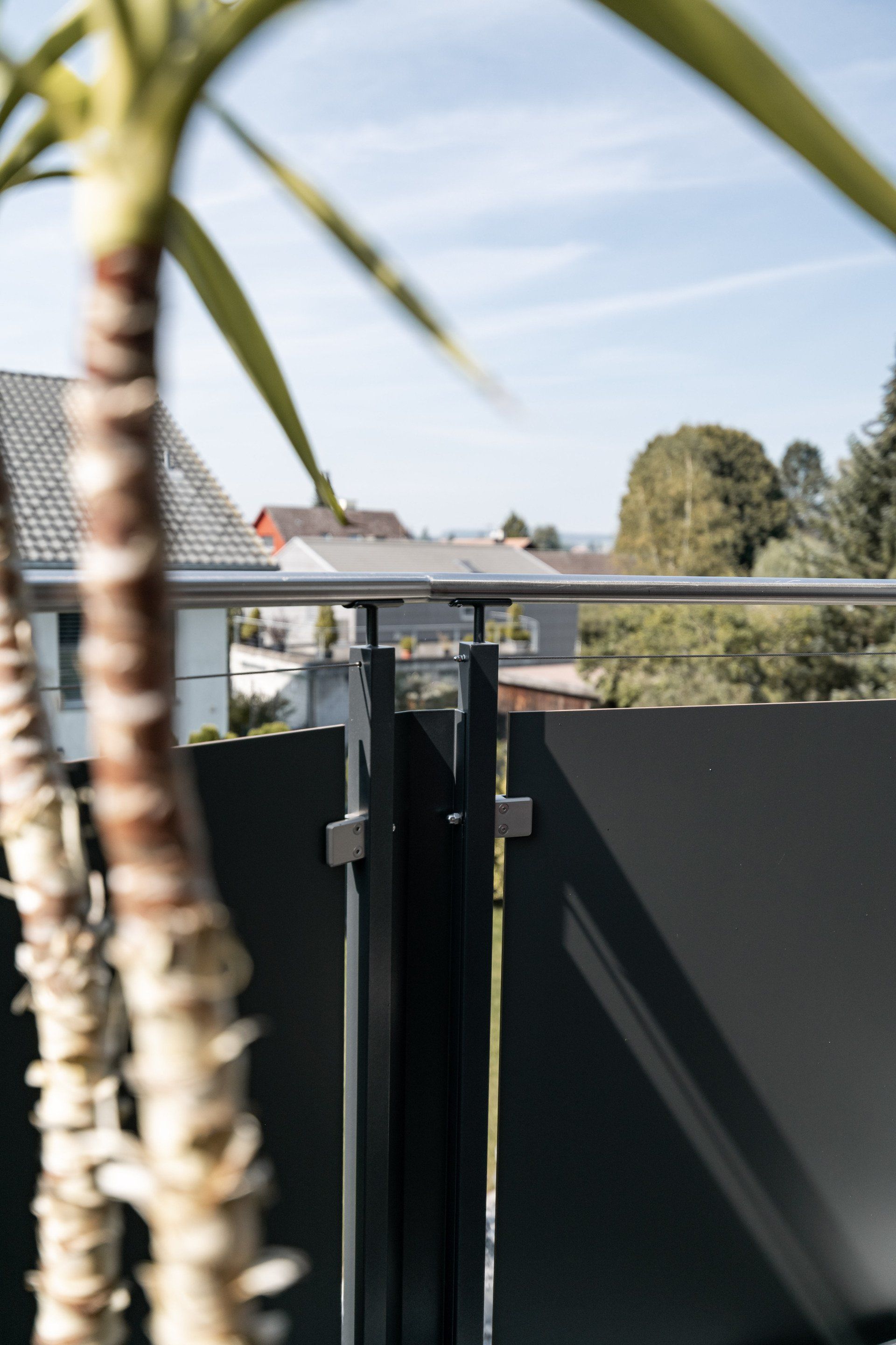 Geländer mit Füllung aus HPL-Platte und CNS Handlauf, pulverbeschichtet