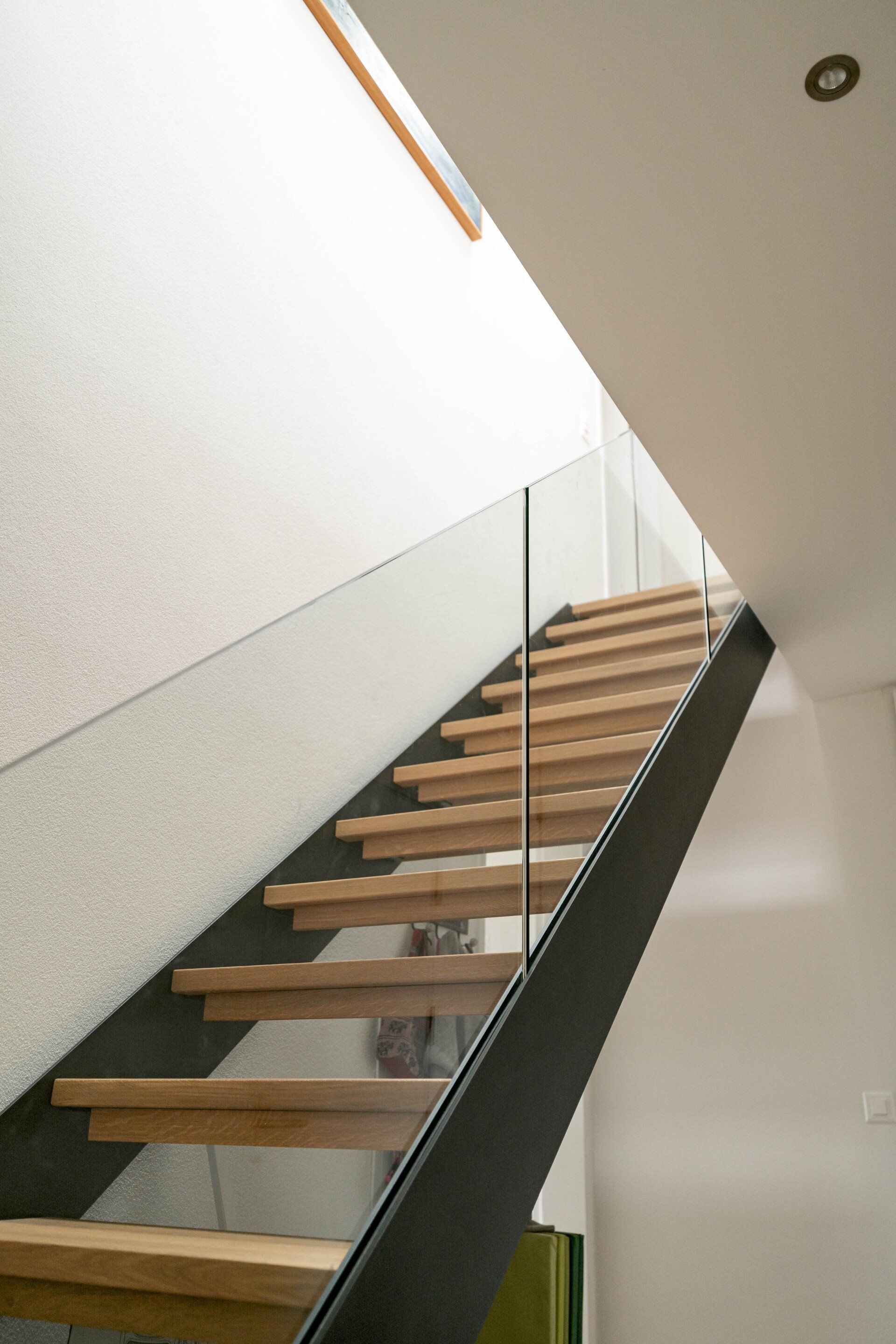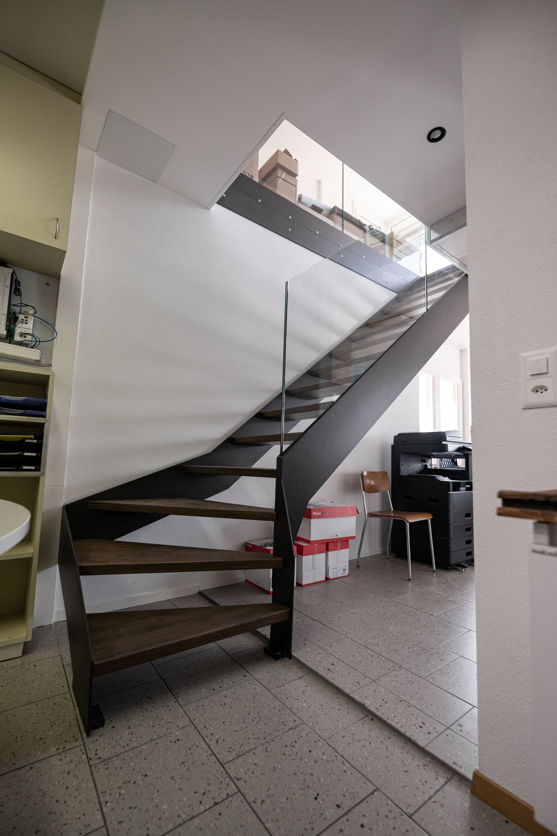Wangentreppe aus Stahl mit Eichenholz Tritten und Ganzglasgeländer, pulverbeschichtet